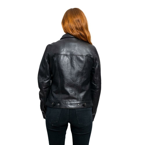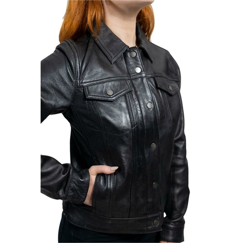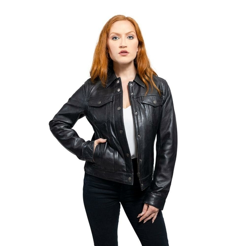 The look of a jean jacket, but in leather! Add a stylish finishing touch to any outfit wearing this women’s Whet Blu lambskin jacket. Also available in Blue.