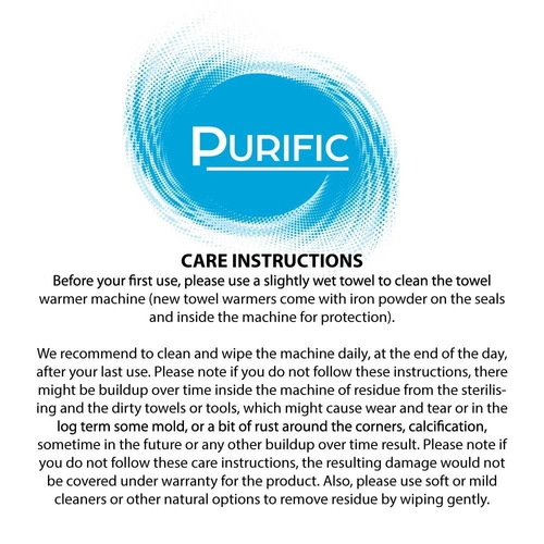 • Before your first use, please use a slightly wet towel to clean the towel warmer before first time using the machine (new towel warmers come with iron powder on the seals and inside the machine for protection)